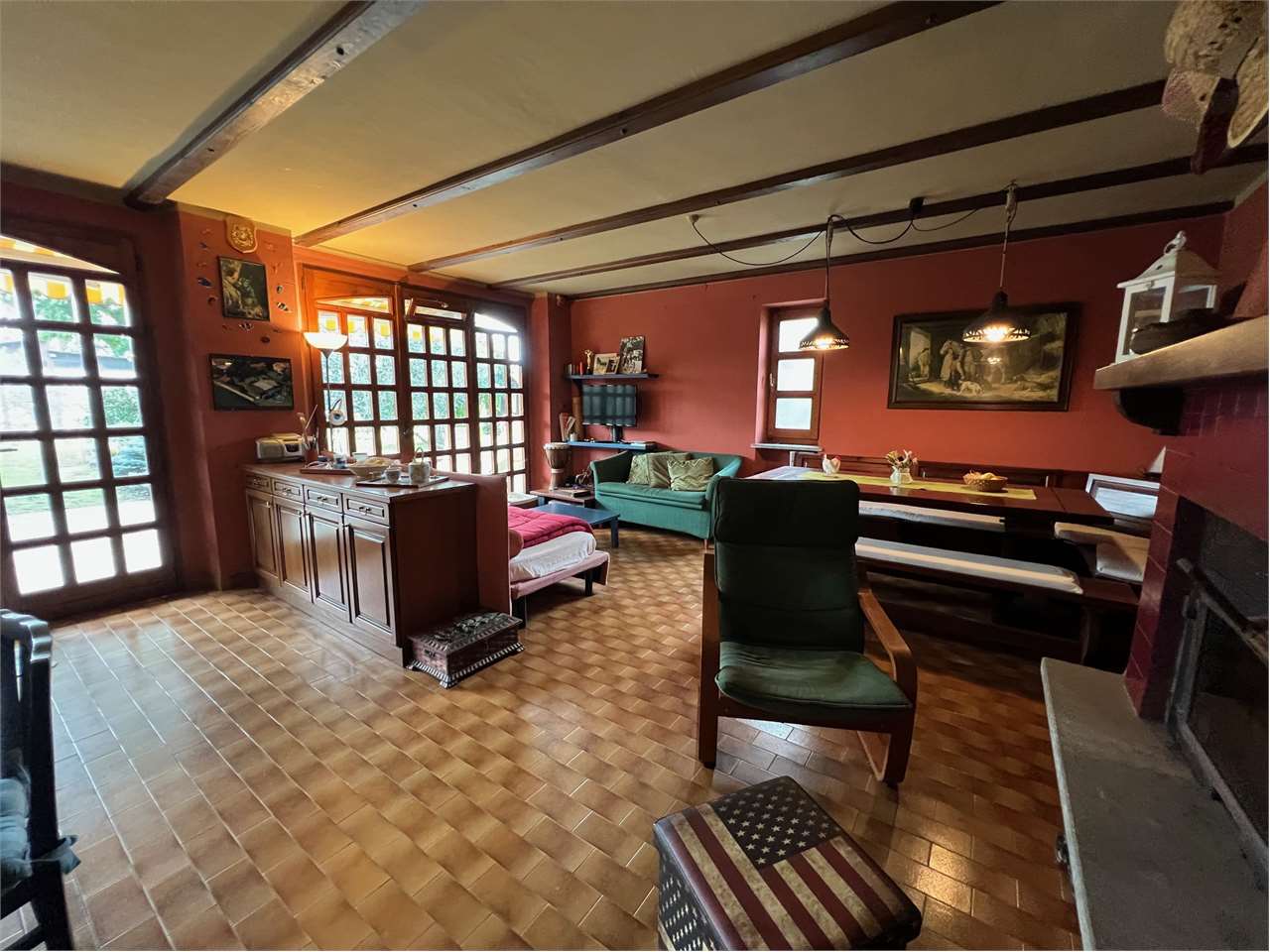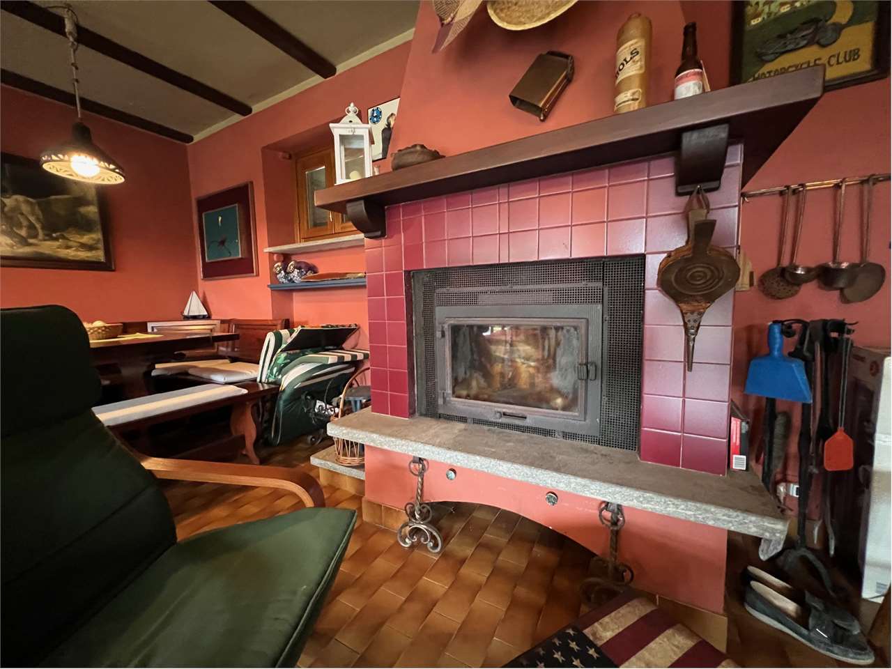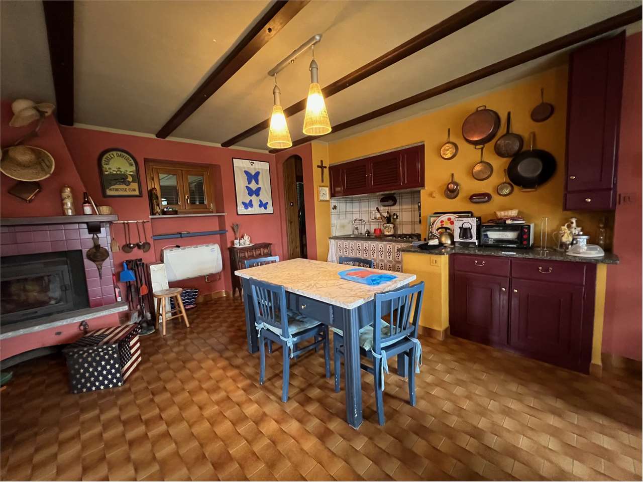 Al piano terra abbiamo un ingresso living su salone con camino a legna e angolo cottura. Al 1' piano due camere da letto, bagno e balcone.