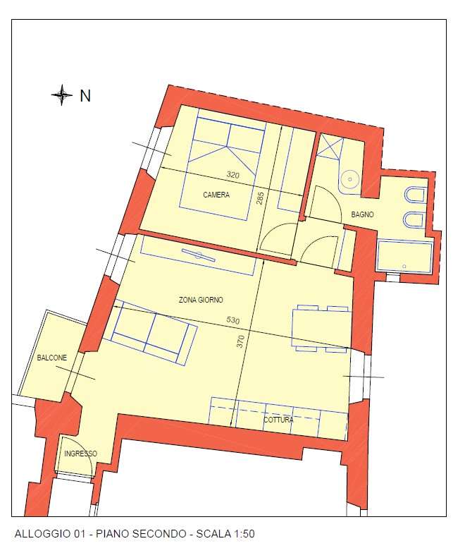 La soluzione si trova al piano secondo e si sviluppa su ingresso living su zona giorno con angolo cottura, camera, bagno e balcone. La soluzione non è ancora ultimata, quindi vi è possibilità di scelta materiali e personalizzazione interna.